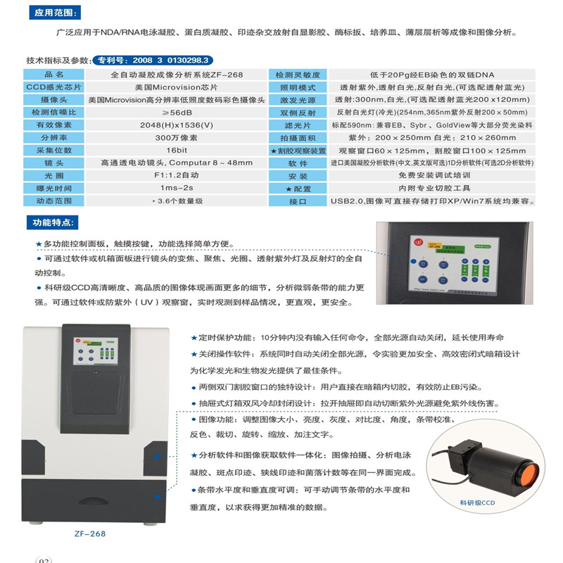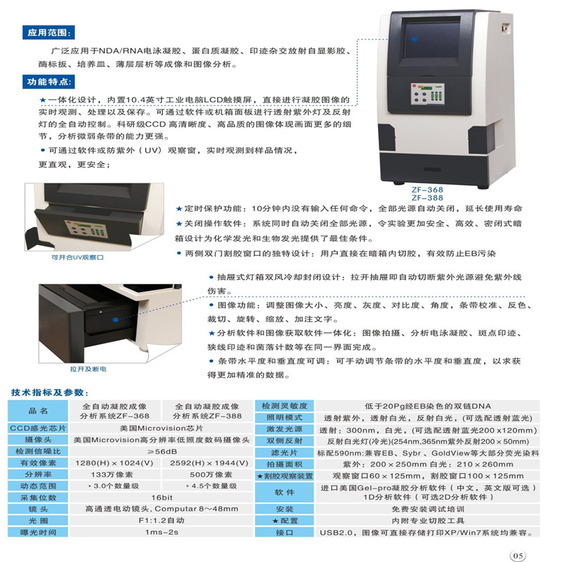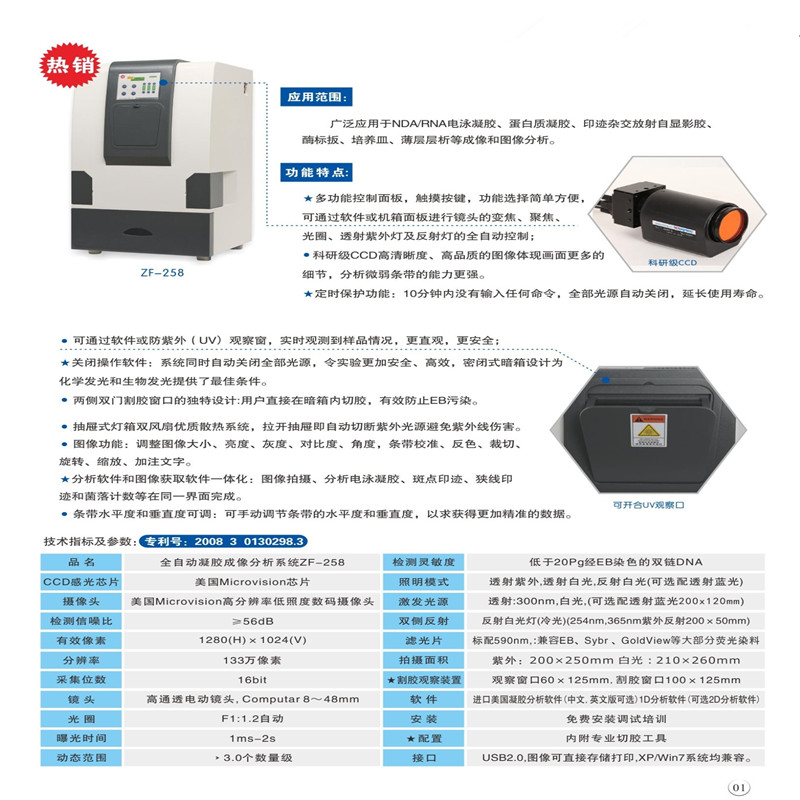 全自動凝膠成像分析系統(tǒng)ZF-288 應(yīng)用范圍: 本系統(tǒng)集知識產(chǎn)權(quán)國家專利一體的全自動凝膠成像分析系統(tǒng)。 采用進(jìn)口專業(yè)CCD和分析軟件.進(jìn)口電動變焦鏡頭.具有圖像清晰.操作簡便等優(yōu)點.產(chǎn)品經(jīng)華東理工大學(xué).武漢 大學(xué).中國科學(xué)院武漢病毒所.華中師范大學(xué).華中科技大學(xué).第四軍醫(yī)大學(xué).西北農(nóng)林大學(xué).蘭州大學(xué).華南農(nóng)業(yè)大 學(xué)、溫州醫(yī)學(xué)院等著名科研院校實驗室使用。成為科研和教學(xué)最佳選擇.廣泛應(yīng)用于NDA/ RNA電泳凝膠.蛋白質(zhì)凝膠. 印跡雜交放射自顯影膠.酶標(biāo)扳.培養(yǎng)皿.薄層層析等成像和圖像分析。 全自動凝膠成像分析系統(tǒng)ZF-288功能特點: ·軟件全自動控制紫外光源、白光板及成像系統(tǒng)的變焦,焦距和光圈等�?梢杂行Х乐�EB污染,更好地保護(hù)實驗人員安全。 ·在面板上進(jìn)行按鍵操作,可等效控制面板紫外燈和成像系統(tǒng)的變焦,焦距和光圈等。 ·系統(tǒng)裝有自動保護(hù)功能,抽屜式全封閉的設(shè)計,拉開即自動切斷紫外光源,有效避免紫外線對人體的傷害。燈箱式設(shè)計, 方便于移膠和清潔,同樣可避免樣品間存在的痕量污染。 ·定時功能:如果使用者10分鐘內(nèi)沒有輸入任何命令,紫外自動關(guān)閉延長紫外壽命。 ·兩側(cè)雙門割膠窗口的獨特設(shè)計,用戶直接在暗箱內(nèi)切膠。 ·防紫外泄露的觀察窗設(shè)計,便于用戶對核酸或蛋白質(zhì)凝膠的直接觀察。 ★ 關(guān)閉操作軟件,系統(tǒng)同時自動關(guān)閉紫外光源。 全自動凝膠成像分析系統(tǒng)ZF-288主要技術(shù)指標(biāo):