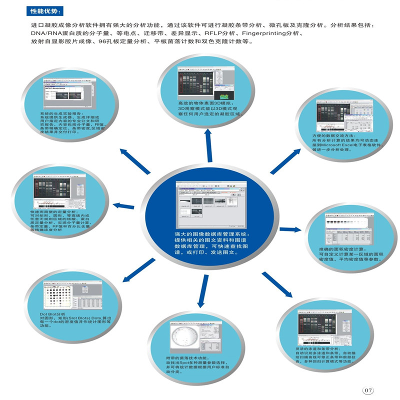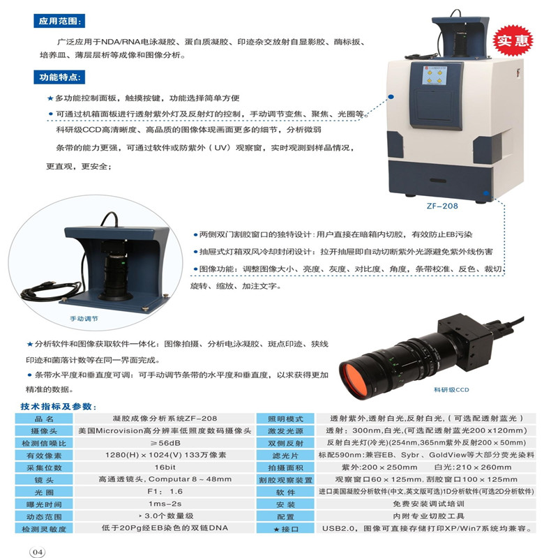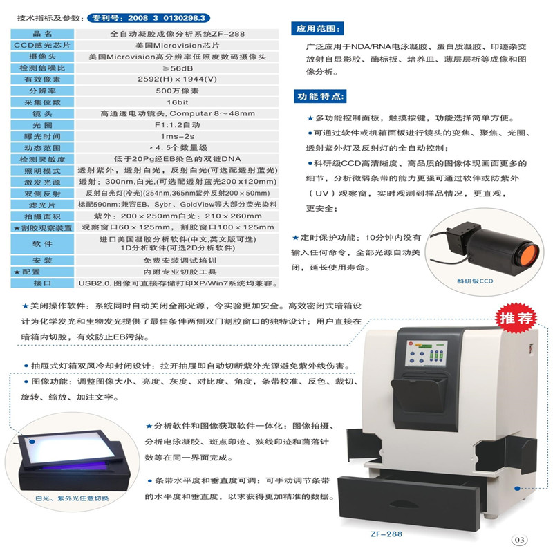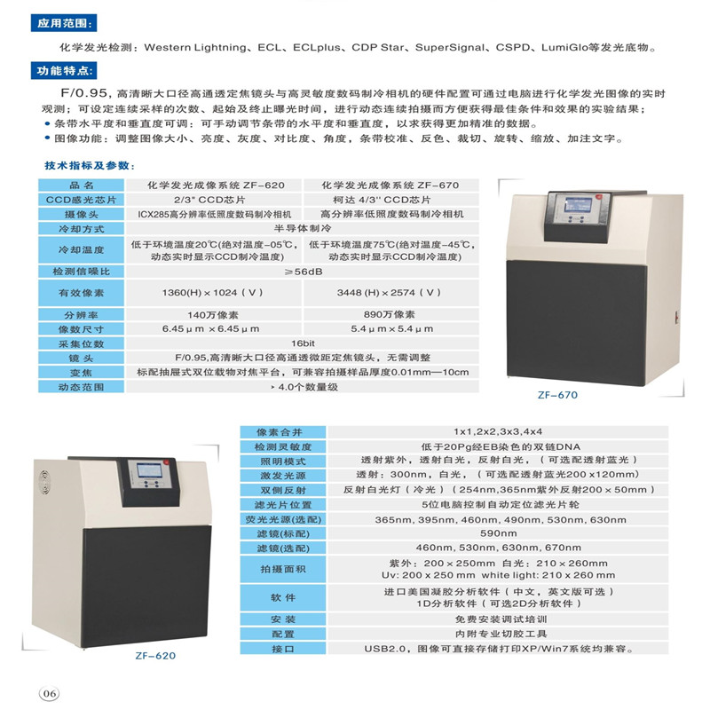 810A一體機(jī)是將穩(wěn)定實(shí)用的810型號整合了內(nèi)置電腦,擁有超大的12英寸液晶顯示屏。無需安裝調(diào)試,操作靈活簡便,外觀小巧精致。隨機(jī)軟件終身免費(fèi)升級。系統(tǒng)安裝正版windows軟件,有一鍵恢復(fù)功能。該機(jī)型由瑞士設(shè)計,中國制造,通過CE認(rèn)證,性價比高。系統(tǒng)配置無線鍵鼠,可直接在儀器上方操作。儀器帶有專用切膠防護(hù)罩,可進(jìn)行切膠操作,最大程度保護(hù)操作者安全。同事可以簡便地更換濾光片。 技術(shù)參數(shù) CCD:美國全進(jìn)口高清晰FirewireCCD 有效像素:1360*1024 像素大�。�4.65*4.65 采集位數(shù):12bit 接口:USB2.0 鏡頭:日本進(jìn)口電動6倍變焦 F1.0 2/3英寸大口徑高通透鏡頭 數(shù)據(jù)處理系統(tǒng):AMD Athlon(tm)5000 Processor 2.21 GHz 內(nèi)存:768MB 硬盤:150GB 電腦外置接口:2個前置USB接口。 顯示屏大�。�12英寸 系統(tǒng)尺寸:430*540*480mm 寬高深 主要特點(diǎn) 1 儀器內(nèi)置電腦,無需安裝調(diào)試,系統(tǒng)可一鍵恢復(fù)。在Multi一體機(jī)上可以直接進(jìn)行切膠,采集,拍攝,分析,儲存,打印。 2 美國全進(jìn)口140萬像素CCD,隨機(jī)軟件終身免費(fèi)升級。系統(tǒng)安裝正版Windows軟件 3 瑞士設(shè)計,中國制造。操作靈活簡便,外觀小巧精致 4 配置無線鍵鼠,可直接在儀器上方操作。 5 CE認(rèn)證,更加可靠 6 帶有紫外切膠裝置,可進(jìn)行切膠操作,同時最大程度保護(hù)操作者安全 7 可簡便更換濾光片,以適應(yīng)不同的染色劑。 如需切膠,我司提供選配的切膠專用罩與紫外防護(hù)眼鏡。如圖所示,即確保了機(jī)箱的密閉性也給使用者提供了更安全的切膠實(shí)驗(yàn)環(huán)境,操作方面也更簡便實(shí)用。